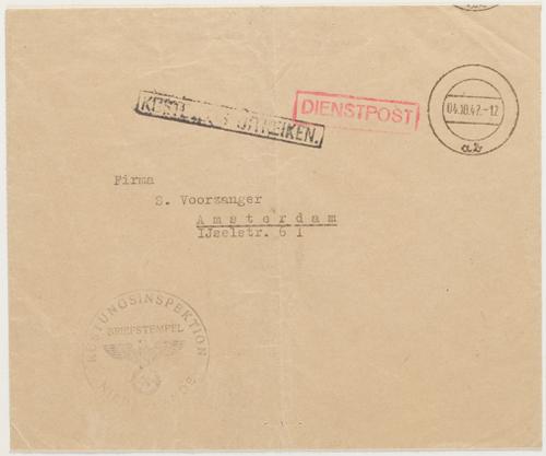 Enveloppe gericht aan de firma S. Voorzanger, oktober 1942