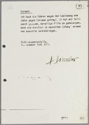 Mededeling van Himmler dat Hitler hem volmacht heeft gegeven om joden tegen deviezen vrij te mogen laten, december 1942