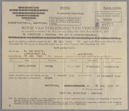 Bewijs van verlenging van arbeidsvergunning (geldig voor het jaar 1943) op naam van Ester Kopel-Rieger, 1943