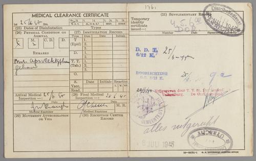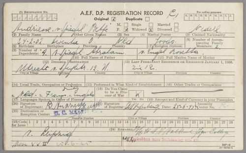 Registratiekaart ('A.E.F. D.P. Registration Record'), op naam van Betje Andriesse-van Spiegel, 1945