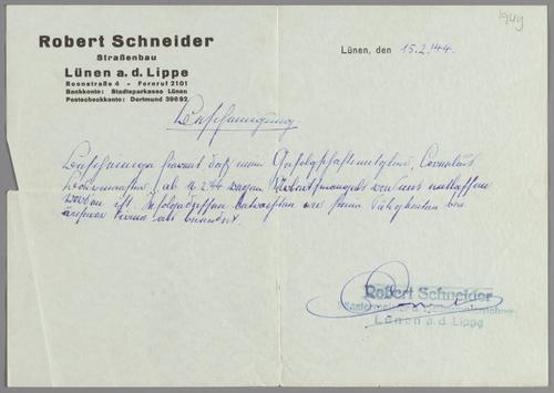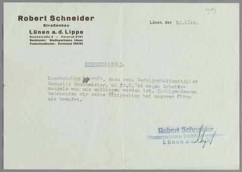 Ontslagbrief van Cornelis Bouwmeester bij firma Robert Schneider, februari 1944.
