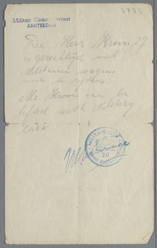 Reisvergunning afgegeven door het Militair Commissariaat Amstedam, voor Salomon Joseph Kroon, 1945