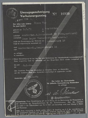 Verhuisvergunning t.n.v. Simon Vos, 1944