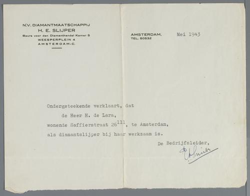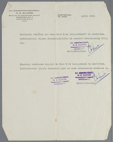 Verklaringen (2) van Diamantmaatschappij Slijper dat H. de Lara aldaar werkzaam is als diamantslijper, 1943