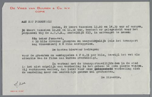 Rondschrijven voor personeel van De Vries van Buuren & Co. betreffende voedseldistributie, maart 1944