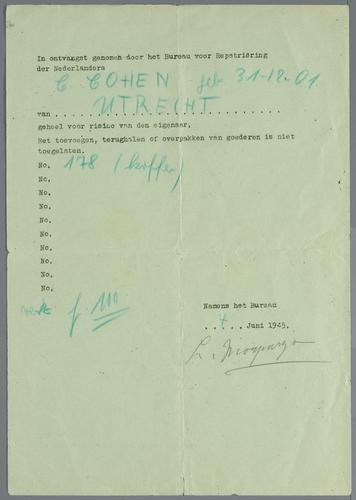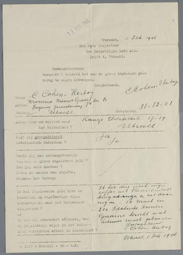 Aanmeldingskaart + andere documenten (ca. 10) betreffende repatriering van C. Cohen-Hertog, 1945