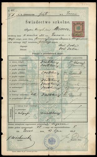 (Overgangs?)diploma van het gymnasium te Lwow ten name van I. H. Meisner met vermelding van de gevolgde vakken, 1901