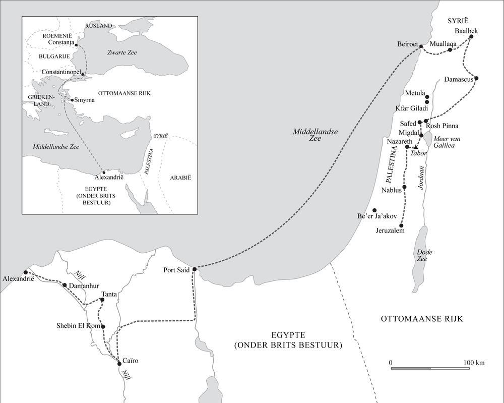 D008352: Landkaart met de route die de Wereldwandelaars aflegden in 1912-1914, toen zij door Turkije, Egypte, Syrië trokken en da [...]