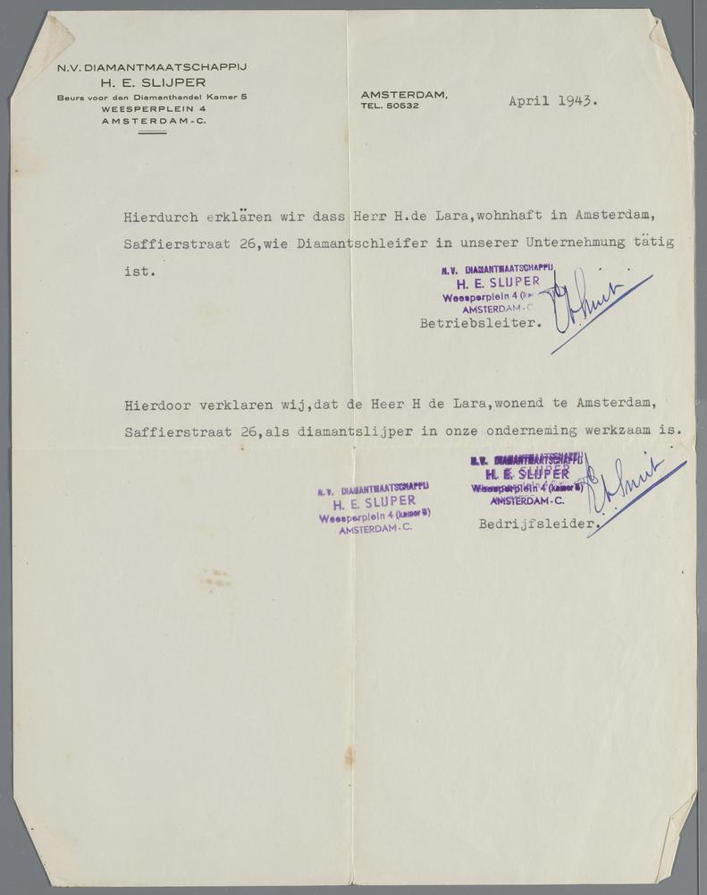 D006430: Verklaringen (2) van Diamantmaatschappij Slijper dat H. de Lara aldaar werkzaam is als diamantslijper, 1943