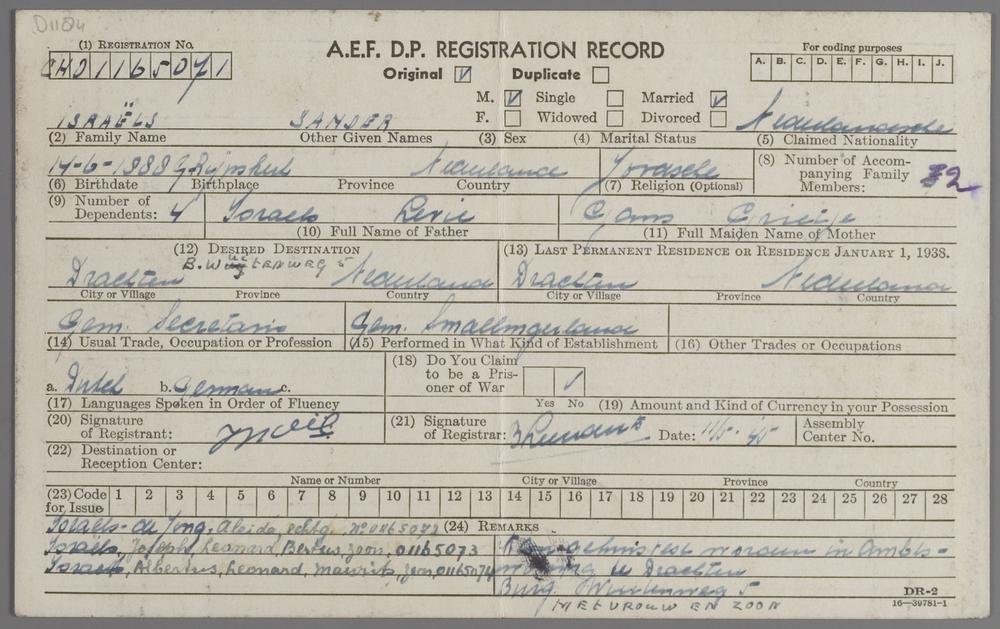 D001184: Registratiekaart van de Allied Expeditionary Force, op naam van Sander Israels, Zwitserland, 1945