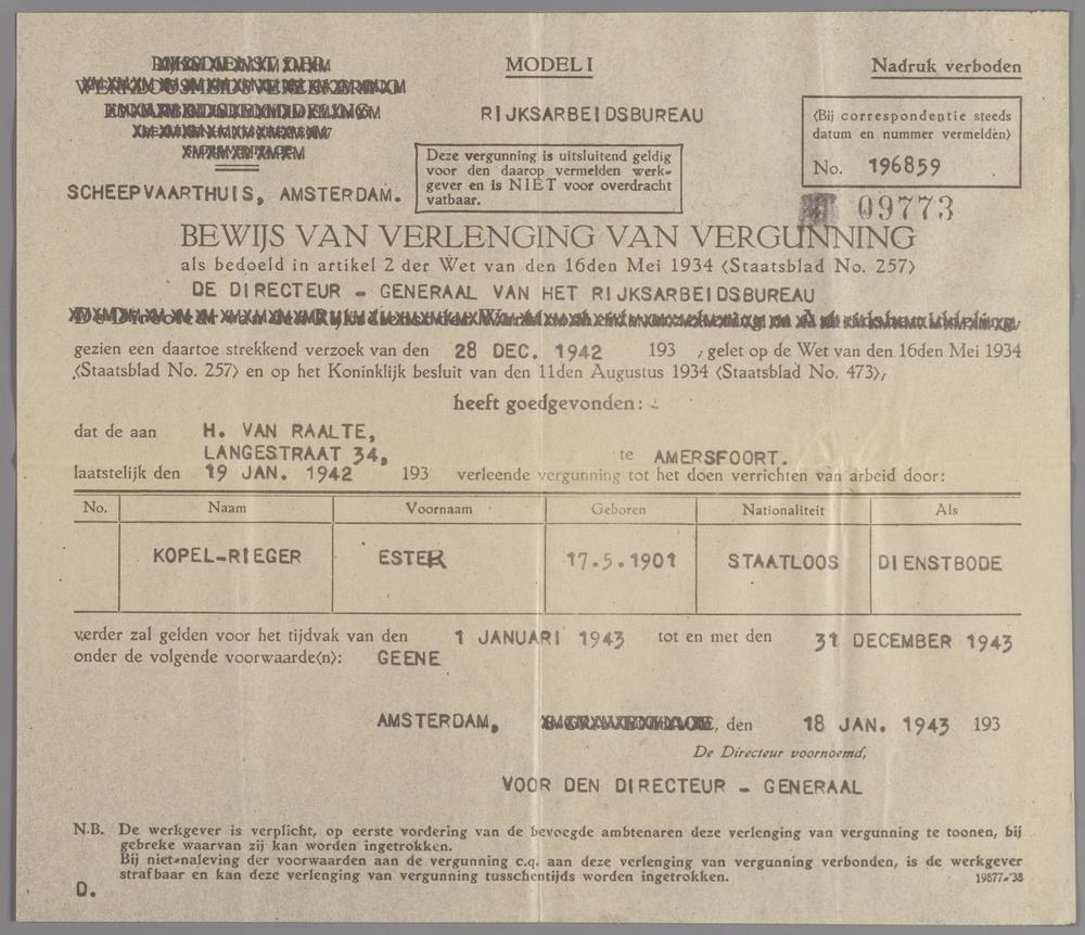D001684: Bewijs van verlenging van arbeidsvergunning (geldig voor het jaar 1943) op naam van Ester Kopel-Rieger, 1943