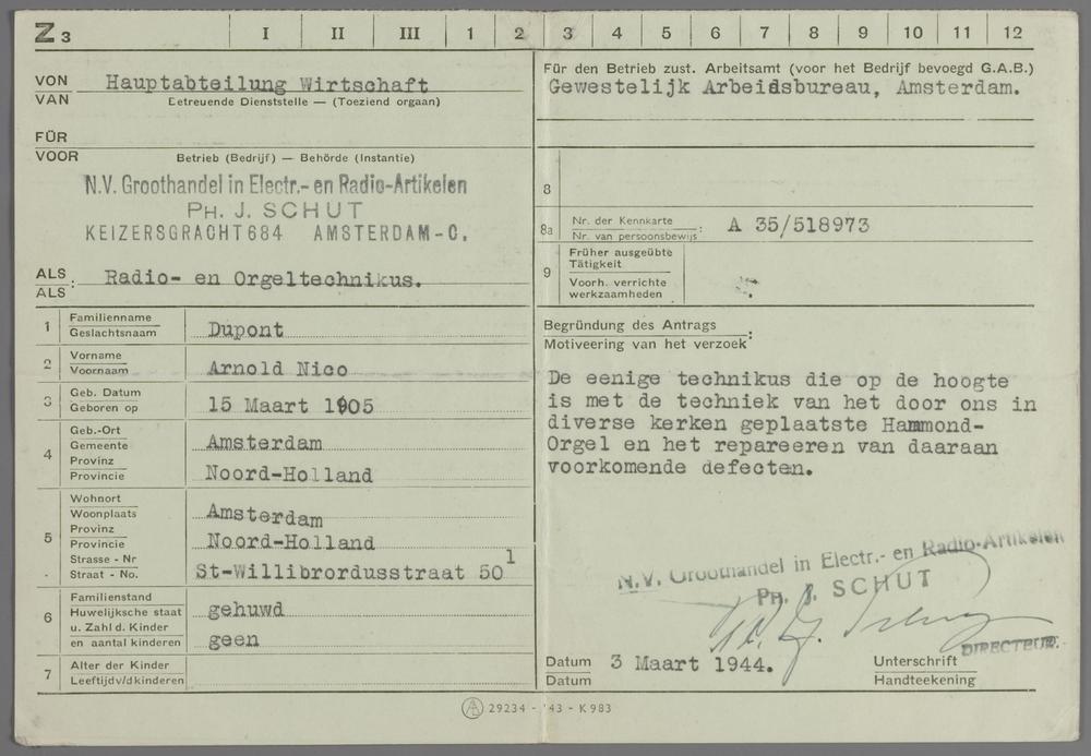 D001120: Verzoek van firma Ph. Schut (Groothandel in Electr. en Radio-artikelen), de werkgever van Arnold Dupont, om deze wegens [...]
