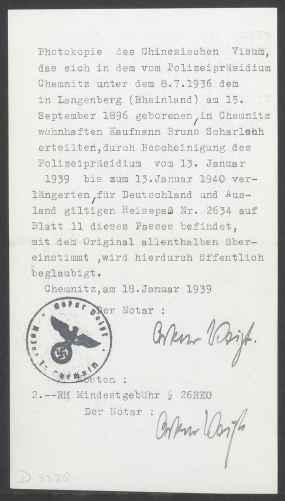 D003328: Geautoriseerde fotocopieen (2) van een uitreisvisum voor China t.n.v. Bruno Scharlach, 1936