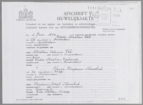 D002033: Uittreksel uit geboorteakte van Roosje benjamin Nieuwkerk, geboren in 1830, bestemd voor afstammingsonderzoek, 1943