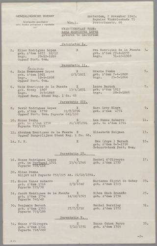 D002501: Kwartierstaat van Sara Rodrigues Lopes, opgesteld door de Genealogische Dienst, november 1942