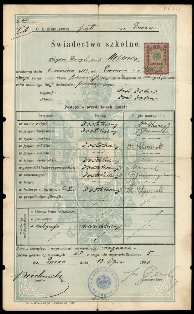D008363: (Overgangs?)diploma van het gymnasium te Lwow ten name van I. H. Meisner met vermelding van de gevolgde vakken, 1901