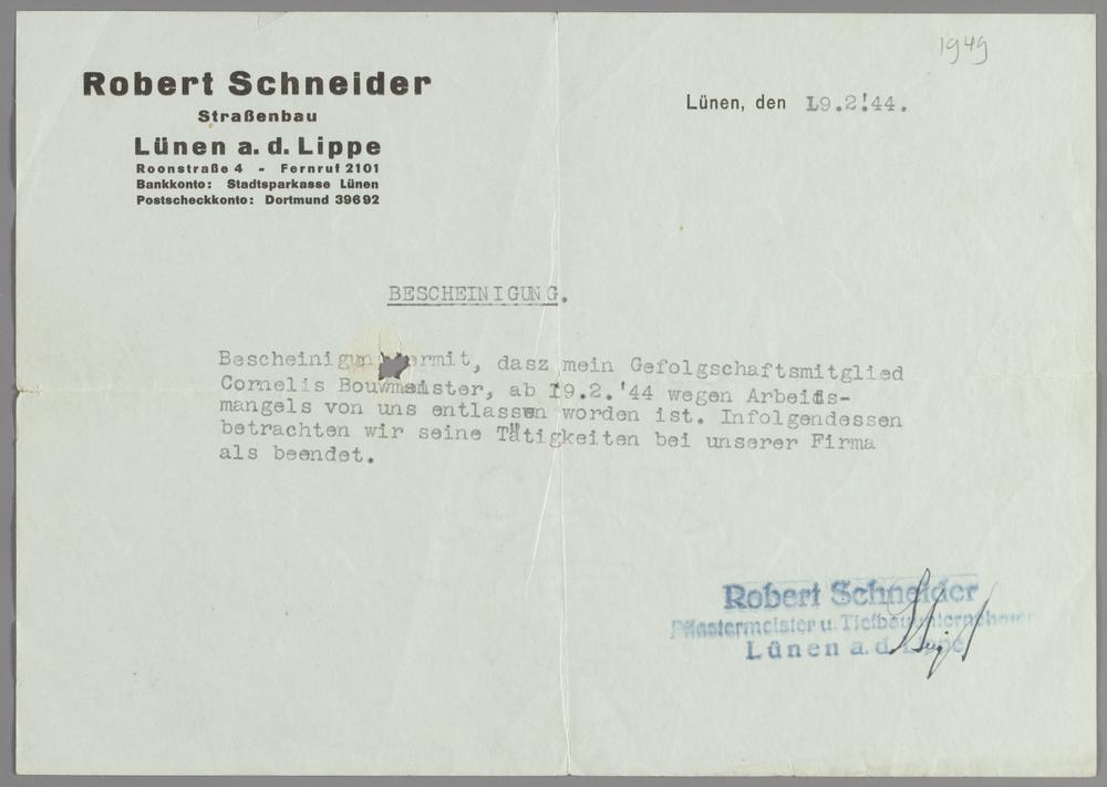D001949: Ontslagbrief van Cornelis Bouwmeester bij firma Robert Schneider, februari 1944.