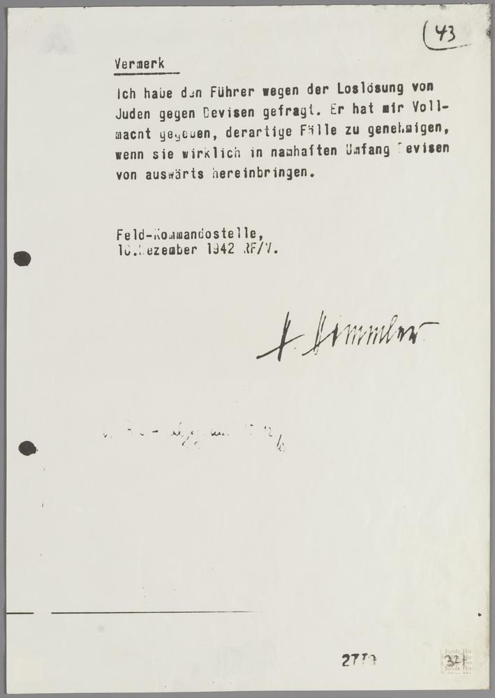 D000786: Mededeling van Himmler dat Hitler hem volmacht heeft gegeven om joden tegen deviezen vrij te mogen laten, december 1942